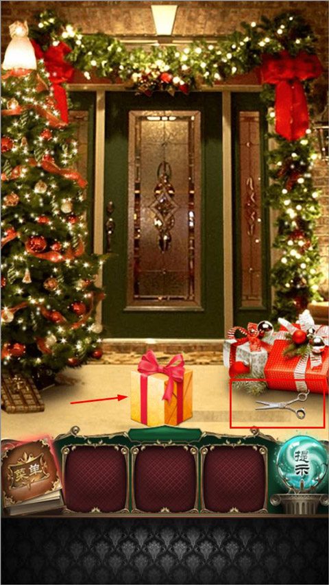第七關(guān)時(shí),我們將右側(cè)的禮物挪到中間位置,隨即發(fā)現(xiàn)地上有一把剪刀。接著,我們用這把剪刀剪開中間的禮物,從中取出一把鑰匙。用這把鑰匙打開大門后,門開啟,我們便進(jìn)入了第八關(guān)。