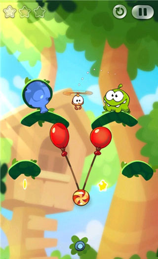 戳破最頂端的氣球,借助糖果下落產(chǎn)生的力量,牽引下方兩個氣球脫離原來的位置,向上飄升。