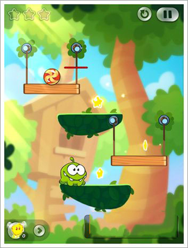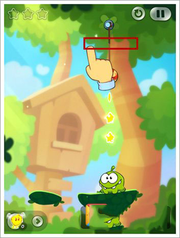 首先,把最下面的繩子剪斷,這樣糖果就會上升,從而吃到第一顆星星。