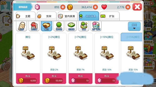 游戲里有上千種商品,像飲料、零食、蛋糕這類美食一應俱全,另外還有窗簾、地毯、貨架等各類設施。