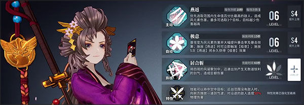 技能層面,一技能“燕返”會鎖定范圍內血量百分比最高的敵人造成高額傷害,同時額外選取三個目標進行攻擊。需要注意的是,后續每多選取一個單位,該技能的傷害就會降低20%,不過即便有此衰減,依托技能本身的強度,實際輸出依然相當可觀。再搭配二技能帶來的自身傷害提升與暴擊率加成,結合居合斬的大范圍群體傷害效果,能讓后續的輸出能力進一步增強。