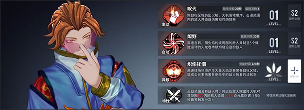 技能方面,其一技能為范圍性火屬性傷害,同時附帶持續五秒的灼傷效果;二技能是以自身為中心、一定半徑范圍內的攻擊,對最多五名敵人造成高額火屬性傷害,還會生成五個火龍卷,對經過路徑上的敵人再次造成火屬性傷害;大招則是大范圍、高傷害的火屬性攻擊,附帶十秒灼傷狀態。需要注意的是,當敵人被該角色的大招施加灼傷后,若再次受到火屬性傷害,其承受的暴擊傷害會相應提高。