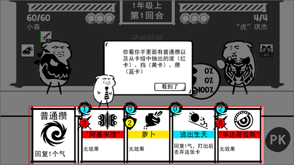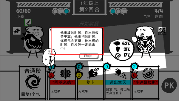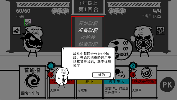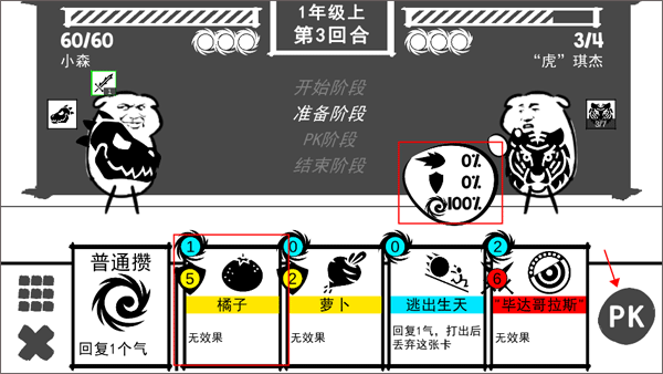 現(xiàn)在需要依據(jù)對方當(dāng)前所處的準(zhǔn)備階段,來挑選對應(yīng)的攻擊方式。選好卡片后點(diǎn)擊“PK”,就能迅速進(jìn)入PK階段,爭取順利從小學(xué)畢業(yè)吧!