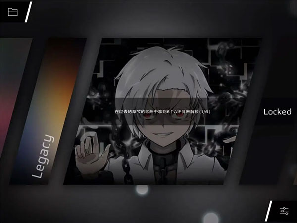 剛進入游戲時,你會看到很多顯示為Locked的內(nèi)容,對應(yīng)的章節(jié)位置和圖中黃字標注的一致。在支線二的右側(cè),還有一個支線三的章節(jié)。建議一開始從左邊數(shù)第二個的Legacy章節(jié)開始,按順序往后游玩解鎖,最左邊的單曲精選集可以當(dāng)作購買歌曲的商店。(目前Legacy章節(jié)包含第一到第四章的內(nèi)容)