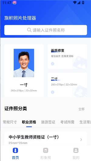 這里為用戶提供職業資格、常規尺寸、旅游簽證、考試所需等十幾種類型的上百種證件照模板