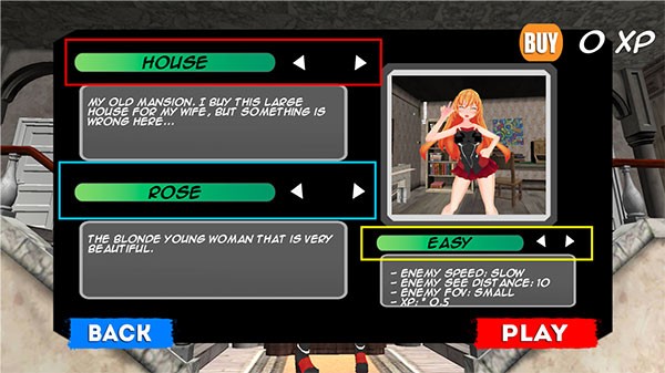進入游戲后,界面呈現如圖所示:紅框標注的“house”按鈕用于切換場景地圖,黃框的“easy”選項可調整游戲難度,藍框的“rose”功能能切換妻子的不同形象。完成各項設定后,點擊“PLAY”即可開始游戲。