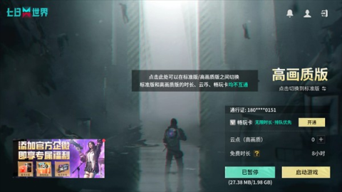 云七日世界是七日世界的云游戲版本,它能讓你擁有極小的安裝包,無需繁瑣下載,打開就能直接暢玩,同時還能體驗到高畫質、高幀率以及低延遲帶來的流暢快感。