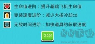 游戲中飛機的生命中、變裝速度和無敵時間可進行強化進階,其中: