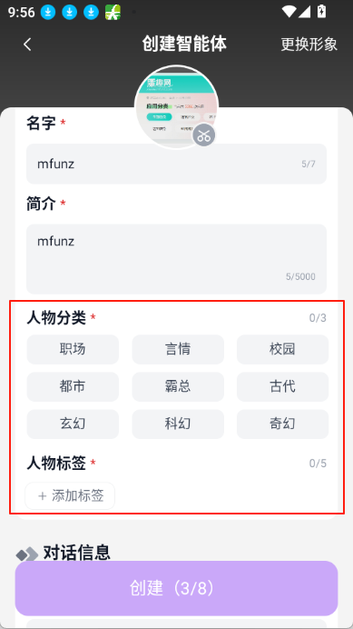 在彈出的對話框里,你可以設置智能體的性別,以及聊天時它對自己的稱呼(最多20個字)。