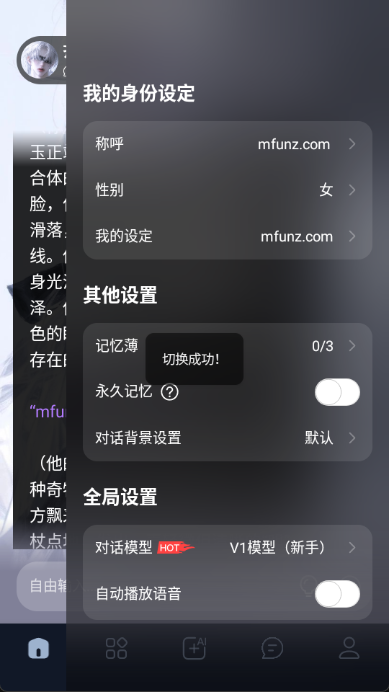 在tofai的聊天對話框里,點擊右上角的【三】圖標就能進入身份設定界面,接著選擇對話模型就可以了。