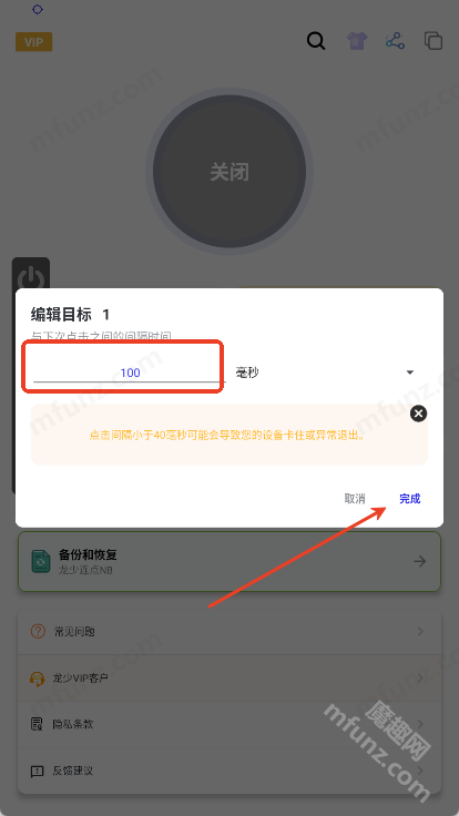 當設置的間隔小于40毫秒時,程序常常會出現崩潰情況。建議您在短時間內進行快速點擊操作。2. 當設備耗電量突然大幅增加時,系統會自動強制關閉相關應用。這個問題可以通過設置“AUTOSTART”和“BATTERY OPTIMISATION”權限來解決。