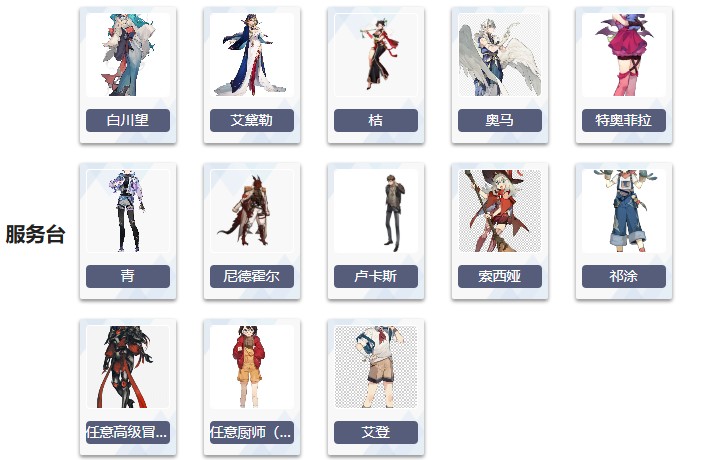 服務臺:白川望、艾黛勒、桔、奧馬、特奧菲拉、青、尼德霍爾、索西婭、祁涂、艾登