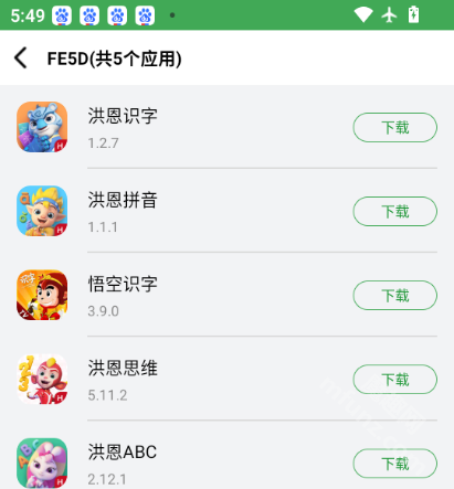 兒童早教組合碼 FE5D,包含洪恩識字、洪恩拼音、悟空識字、洪恩思維、洪恩ABC這幾款內容。