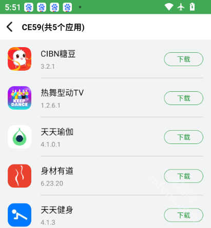 運動健身組合碼 CE59 包含 CIBN 糖豆、熱舞型動 TV、天天瑜伽、身材有道、天天健身這幾個內容。