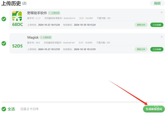在上傳歷史中,選擇多個應用即可生成組合碼。