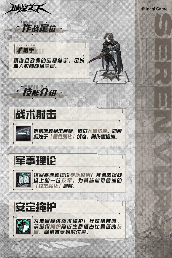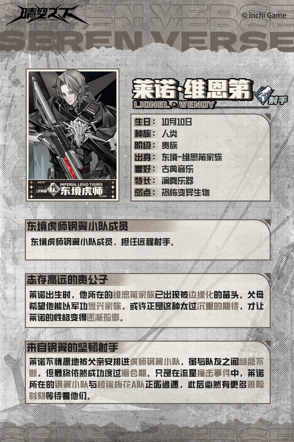 角色背景:被家長安排進入軍隊歷練的貴族公子。其孤僻內向的性格本與軍旅生活格格不入,但也終究融入了所在的鋼翼小隊,成為了可靠戰力。