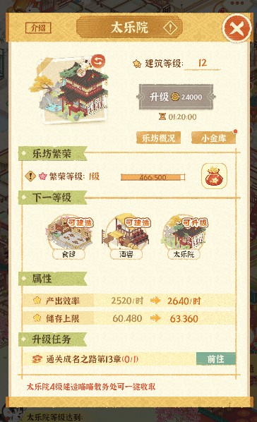 「太樂院」是城建體系的核心建筑,唯有先升級太樂院,才能解鎖其他建筑的建造權限。想要讓樂坊持續發展壯大,坊主們可得多花心思升級太樂院呀~隨著坊主大人的用心經營,太樂院等級提升后,您可以通過太樂院的功能界面查看,了解等級提升后哪些建筑具備了升級條件,這樣就能提前規劃好資源儲備和學員調配啦——畢竟建筑等級的提升,可是能直接帶動經營效益增長的呢!