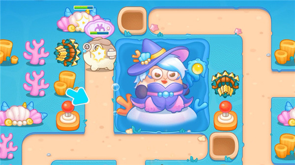 深海女巫拋出紫色的能量泡泡,把炮塔整個(gè)裹了起來,炮塔一下子就沒法攻擊了!大家趕緊幫忙把這些紫色泡泡戳破,和阿秋一塊兒對(duì)抗女巫,把這場(chǎng)危機(jī)解決掉!