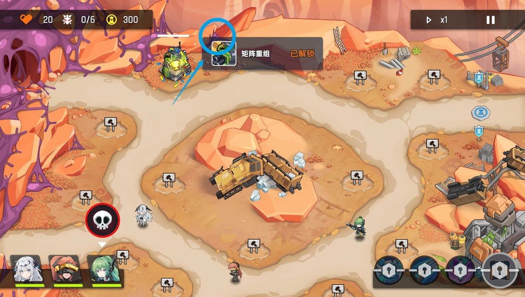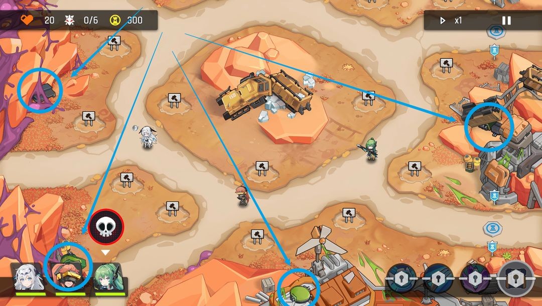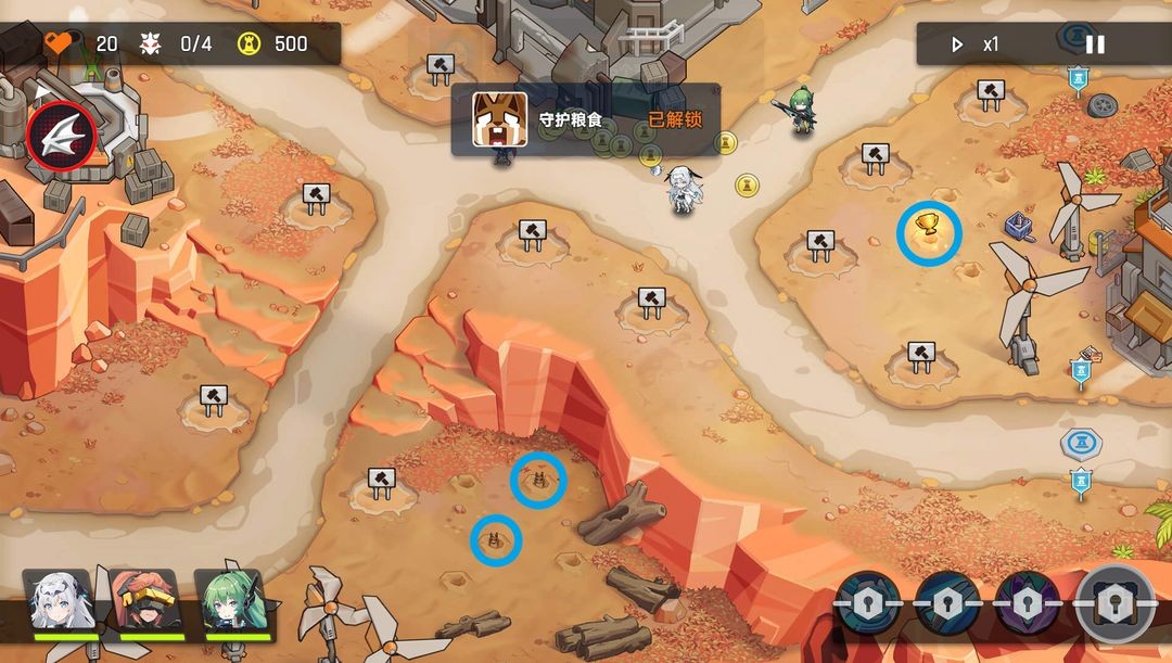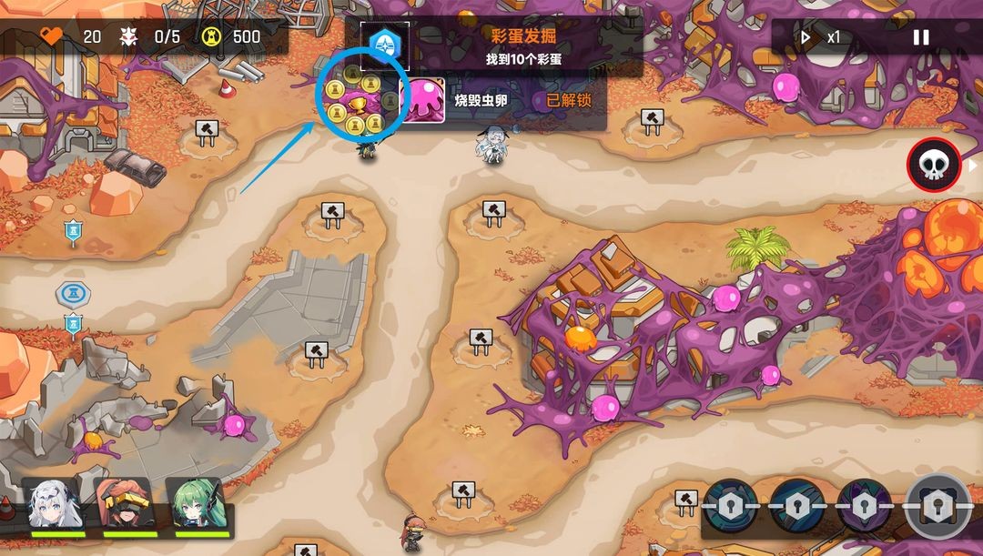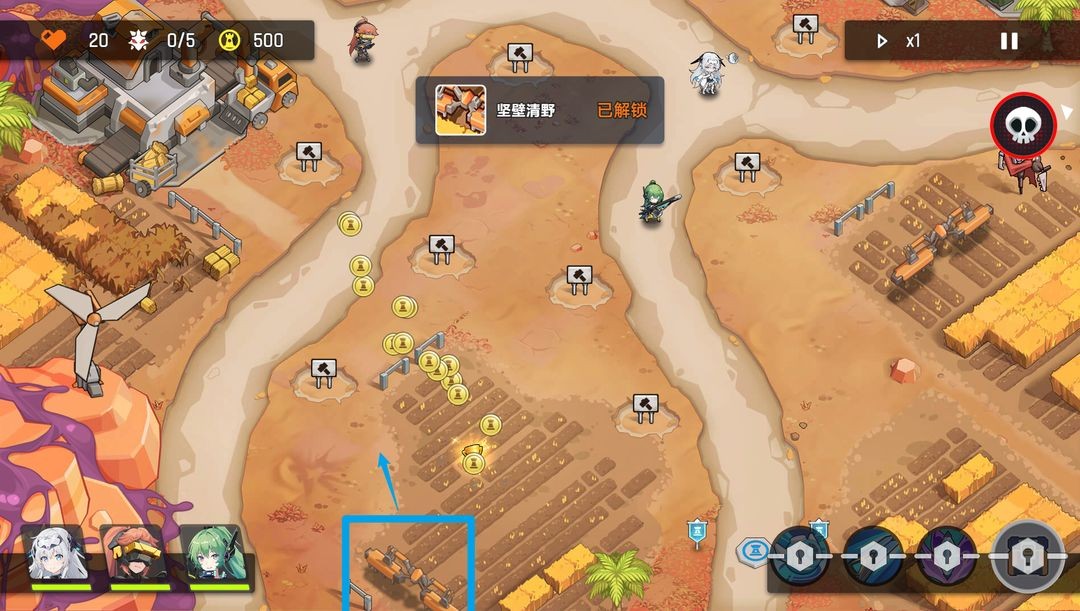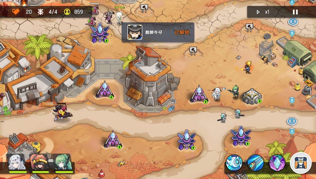 1-7:關卡:地圖右側的牛仔角色,會隨機秒殺3只怪物,建議把這個技能留到最后一波大怪出現時使用(未開始游戲時無法點擊該功能)