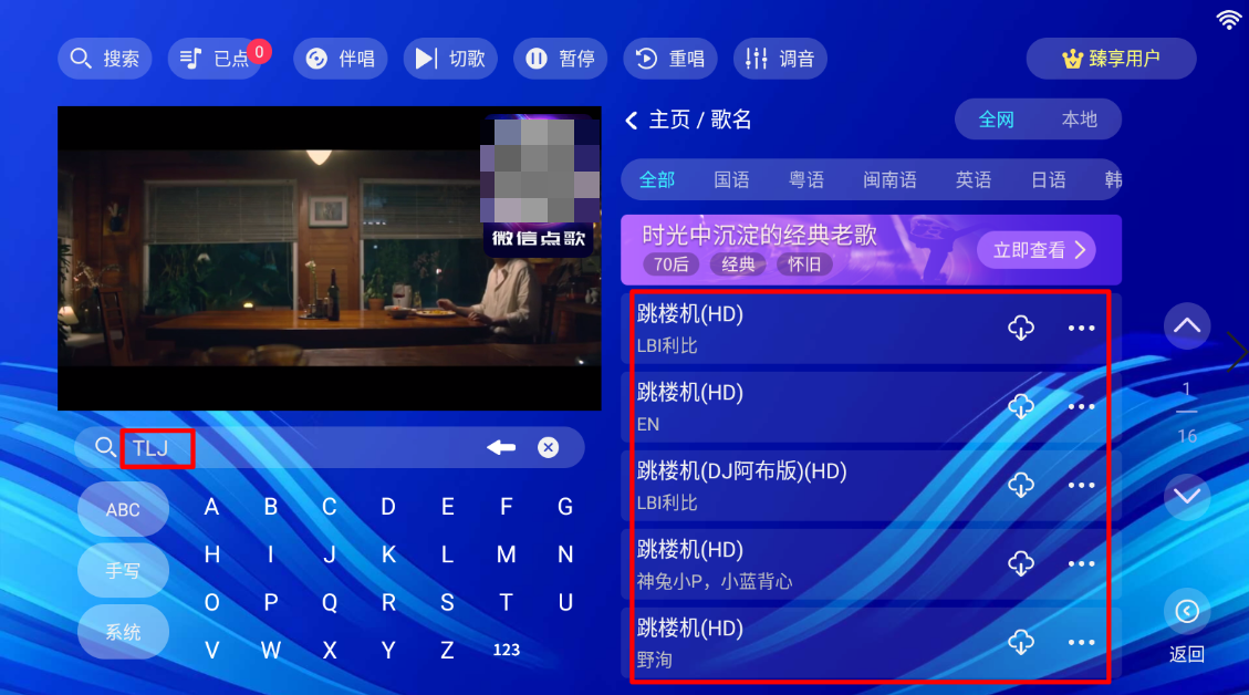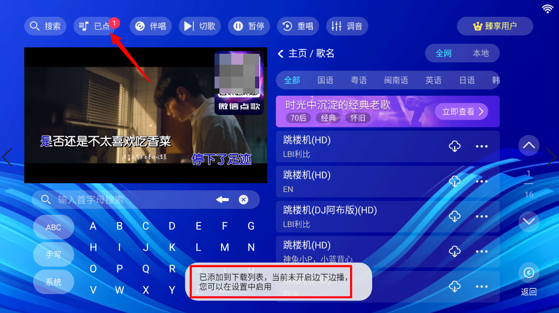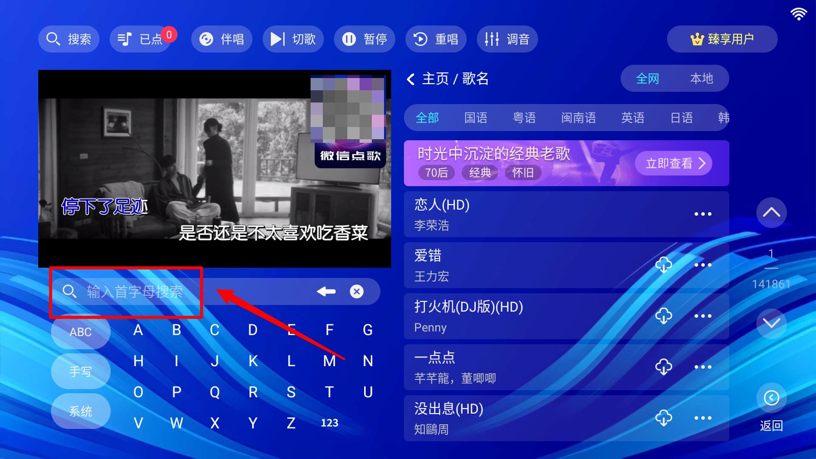 以"歌名點歌"為例,輸入首字母就可以進(jìn)行點歌。