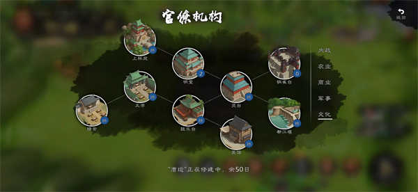 第一項官僚(即科技)分為圖中所示的五項,個人建議開局選擇2精舍搭配1太學。至于優先發展哪些科技,其實主要得結合自身實際情況來定。我個人的習慣是,先采用2精舍1太學的配置,接著優先點軍事科技,把募兵相關的科技全部點滿;之后再點內政科技,先把所有倉庫都升到1級,再去點兵力上限的科技。商業和農業科技沒什么太大用處,只有商業科技里的漕運以及加快調遣的科技是有用的——這里說明一下漕運的作用:點了漕運后運輸部隊可以走水路,換句話說,如果沒點漕運的話,運輸隊是無法過河的。
