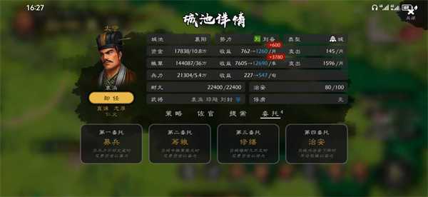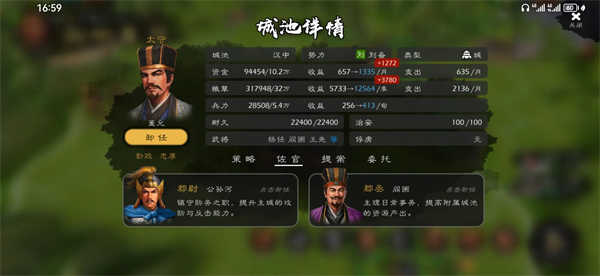 城池詳情,太守(選高智政的話錢糧收益更高,高武統的則加兵效果更明顯,也可以留意培養系統里帶buff的人選),策略方面,前期建議優先點軍事策略,后期就根據自己的需求來選擇。