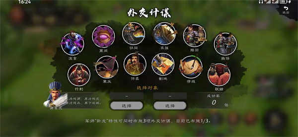 接下來點擊左上角的頭像,就能更換軍師了。選擇軍師時,要挑帶有勤政效果的,并且得是高智政的類型,至于計謀的執行方法,后面再詳細說明。