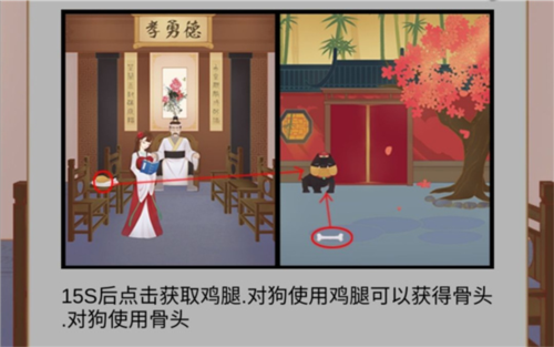 然后去后院把雞腿喂給狗狗,等它吃完就能得到骨頭,最后把骨頭放到狗狗的頭上就完成了。
