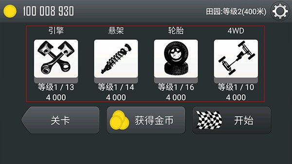 另外我們在游戲中獲得的金幣可以用來購買新的車輛、解鎖新的地圖、也可以為汽車引擎、懸架、輪胎、4WD進行升級來提升汽車的速度等