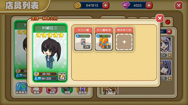 店員個人狀態均可單獨查看,給體力不足的店員補充體力,體力藥水可以在商店購買