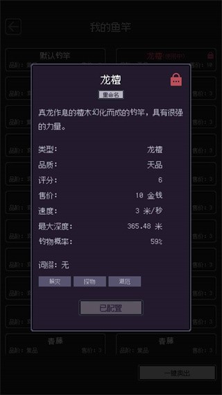 老漁夫賣木魚竿,包括圖紙;擁有一個釣技硬化+2%釣物率,少許下潛深度,小青魚換柴木,老慈善家了。