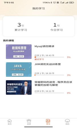 學習進度管理一目了然,能直觀查看每門課程已完成的章節以及整體學習進度的百分比。