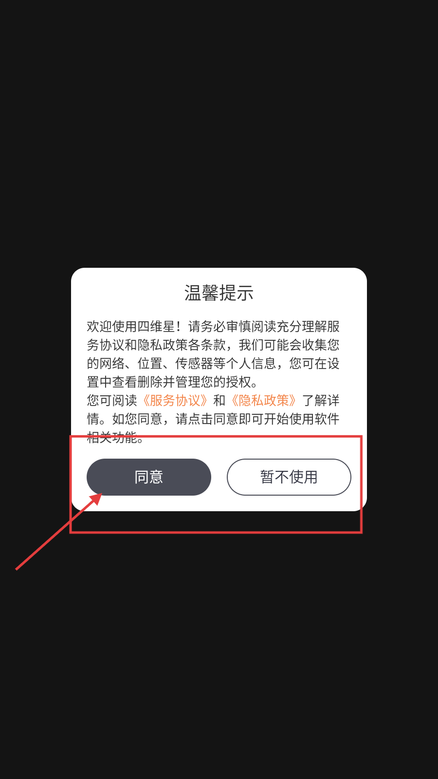 首次使用四維星軟件時,需要閱讀服務協議與隱私政策,點擊“同意”按鈕后,就能開啟軟件相關功能的使用。