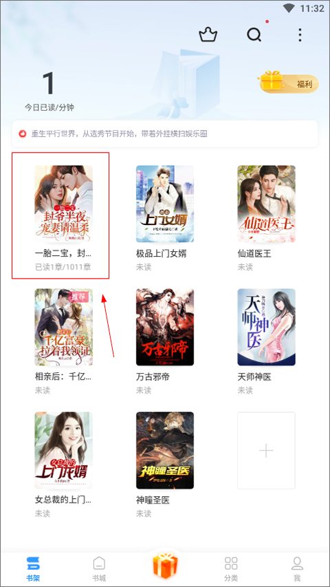 首先打開瘋讀小說應用,點擊界面上的【書架】選項,從中找到一本想要閱讀的小說。