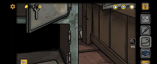 我們回到最初待著的房間,點(diǎn)擊大門,用鉗子剪斷連著的地方,出門后在左邊門的下方取得鐵絲。