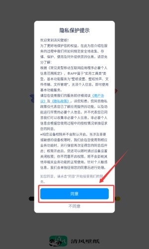 在隱私提示頁,點擊紅色箭頭所指的同意按鈕。
