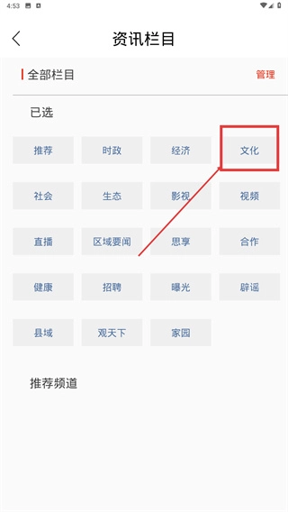 在資訊欄目頁面,點擊【文化】分類按鈕,就能篩選出文化相關的新聞資訊,便于精準瀏覽。