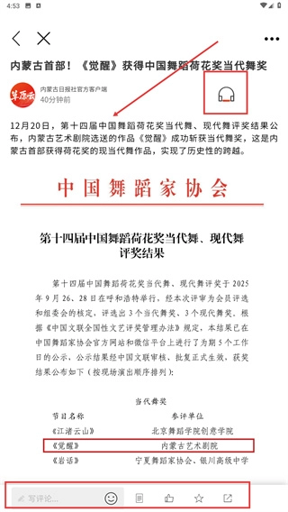 打開新聞詳情頁面后,點擊界面上的【耳機圖標】就能收聽新聞內容;頁面底部的互動按鈕支持點贊等功能,能讓閱讀體驗更加豐富。