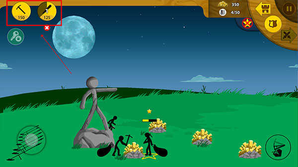點擊右上方,可以創(chuàng)造專門挖礦和進攻的士兵;