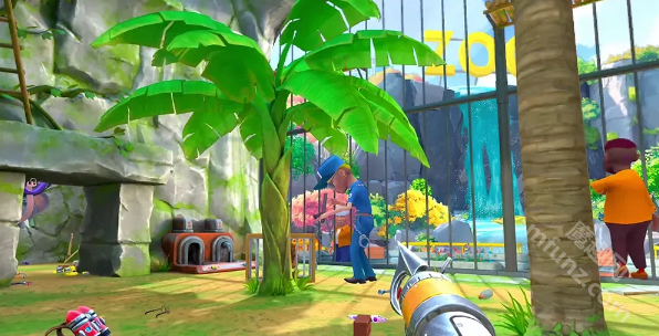 《我是猴子》(I Am Monkey)打造了物理驅(qū)動(dòng)的沉浸式交互體驗(yàn):玩家能攀爬跳躍、抓著藤蔓擺蕩、投擲香蕉,還能偷偷拿走游客手里的東西。游戲場(chǎng)景采用沙盒設(shè)計(jì),支持玩家自由探索、隨性創(chuàng)造玩法——比如用樹(shù)枝撬開(kāi)飼料箱偷取食物,或是在下雨天故意滑倒,逗得游客發(fā)出驚呼。