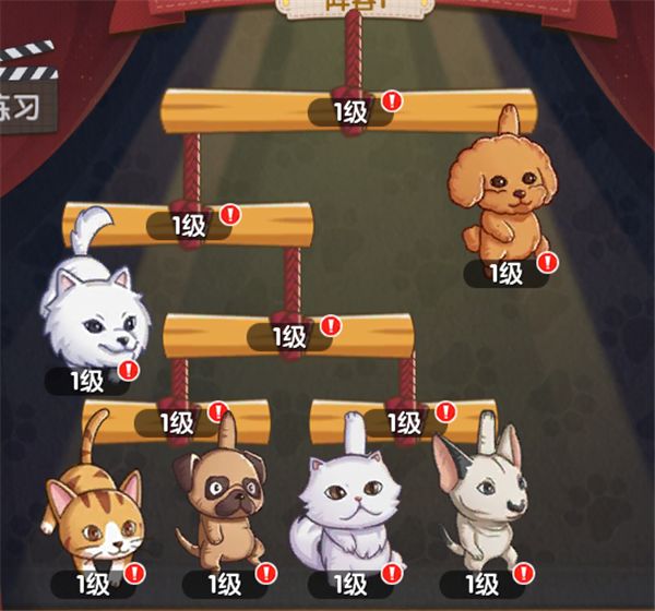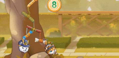 當對方擺出以下這種陣型時,割繩操作會變得比較困難。這是因為上方有動物阻擋了割繩的路徑,沒辦法直接讓它們全部被團滅。此時我們可以選擇一些具備穿透技能的動物發起進攻,像柯基、日本田園貓這類,以此來提升容錯率。