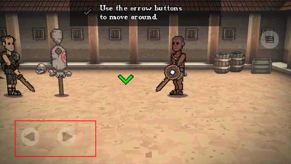 接下來(lái)是新手引導(dǎo)環(huán)節(jié),第一步需要通過(guò)左側(cè)的左右按鈕來(lái)操控角色移動(dòng),等玩家移動(dòng)到綠色指示箭頭所在的位置,就可以開(kāi)啟下一步操作了。