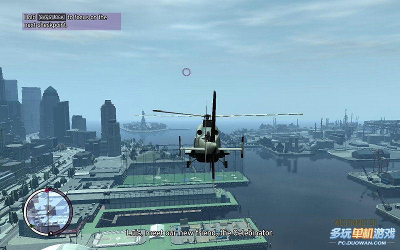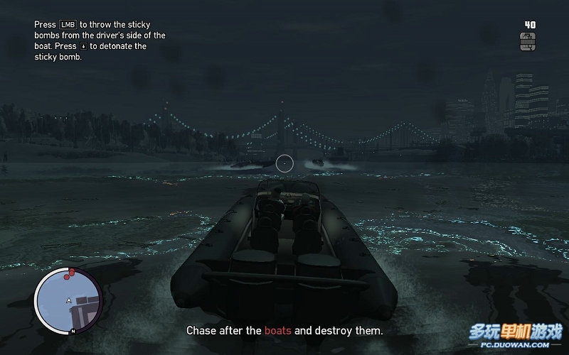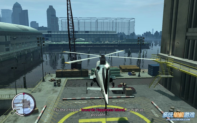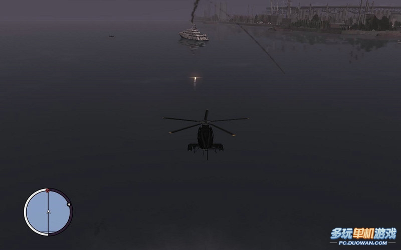 然后YURSUF會給你打電話,讓你先把這些游艇的家伙解決了,在送回到飛機場這算這部資料片最難的任務了,因為操控相當的不舒服。尤其是第一次接觸GTA的玩家,首先基本操作時;WS是上升,下降,AD是向左右傾斜;鼠標向前是機頭向下傾斜,向后則是機頭向上傾斜。鼠標向左右移動則是分別機身向左右傾斜對于這個武裝直升機;鼠標左鍵是發射導彈;右鍵是瞄準;LSHIFT是發射機關槍。