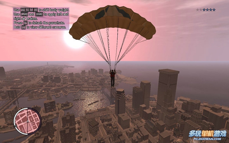 這里就是讓玩家體驗到另一個本DLC的新特點;跳傘跳傘其實不是很難的操作;只不過要注意的要點很多基本的操作;WS分別是身體向前向后傾斜;LMB RMB則是調整降落傘向左向右傾斜。WS在跳傘的時候,有加速前進的效果;LMB RMB在對于快接近目標降落點的時候,你可以讓降落傘不斷的向左向右;減緩降落速度,從而盤旋落地跳傘的時候你可以先不急著按LMB(鼠標左鍵)打開降落傘,如果目標較遠的話,可以先按W沖刺一下,提高你下落的初始加速度。