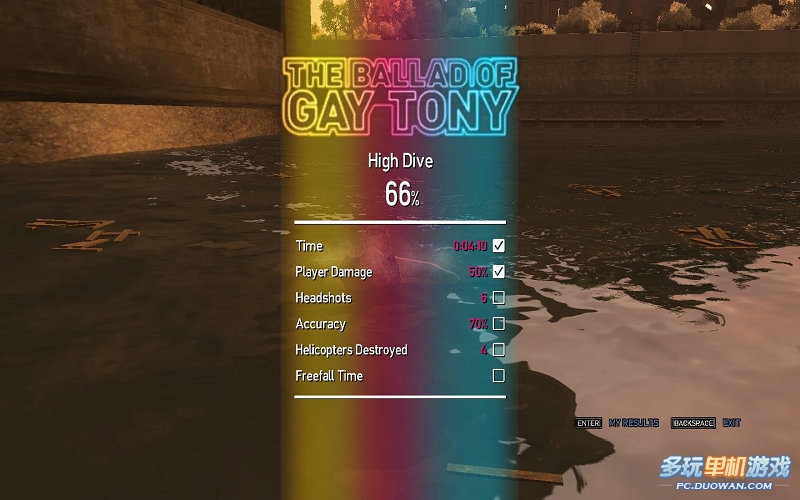 這個任務完成100%不是很難,如果達不到100%也就是時間的問題第一時間要求4分35秒,第二玩家受傷值要在20%之內,第三則是直升飛機損壞度要在80%以內